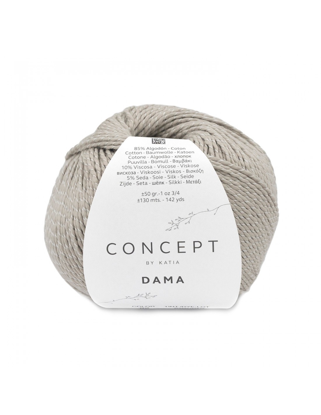 Dama es un hilo dulce y cálido con un bonito relieve efecto ondé. Gracias a su particular estructura, Dama aporta a tus tejidos una agradable textura de aspecto moderno y desenfadado. Ovillo de 50 gramos y 130 metros. Se recomienda tejer con agujas del 3-3,5 mm / US 4-5 o ganchillo del 3,5-4 mm / US E4-G6. Para realizar un jersey de mujer de manga larga talla 42 se necesitan 8 ovillos. Para la muestra de 10x10cm trabajar 24 puntos y 31 vueltas. Lavable a máquina hasta 30ºC. No centrifugar. No usar secadora.