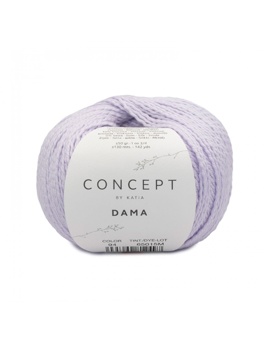 Dama es un hilo dulce y cálido con un bonito relieve efecto ondé. Gracias a su particular estructura, Dama aporta a tus tejidos una agradable textura de aspecto moderno y desenfadado. Ovillo de 50 gramos y 130 metros. Se recomienda tejer con agujas del 3-3,5 mm / US 4-5 o ganchillo del 3,5-4 mm / US E4-G6. Para realizar un jersey de mujer de manga larga talla 42 se necesitan 8 ovillos. Para la muestra de 10x10cm trabajar 24 puntos y 31 vueltas. Lavable a máquina hasta 30ºC. No centrifugar. No usar secadora.