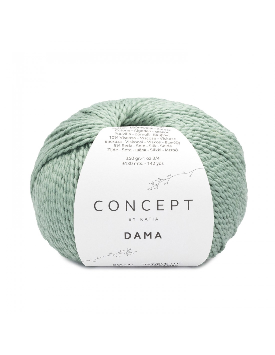 Dama es un hilo dulce y cálido con un bonito relieve efecto ondé. Gracias a su particular estructura, Dama aporta a tus tejidos una agradable textura de aspecto moderno y desenfadado. Ovillo de 50 gramos y 130 metros. Se recomienda tejer con agujas del 3-3,5 mm / US 4-5 o ganchillo del 3,5-4 mm / US E4-G6. Para realizar un jersey de mujer de manga larga talla 42 se necesitan 8 ovillos. Para la muestra de 10x10cm trabajar 24 puntos y 31 vueltas. Lavable a máquina hasta 30ºC. No centrifugar. No usar secadora.