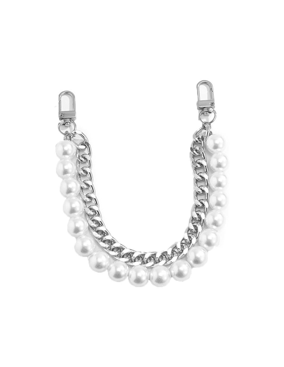 Sofisticación en tonos plata y nácar Esta asa ofrece lo mejor de dos mundos: el clasicismo de las perlas y el brillo moderno del metal plateado. Es el accesorio perfecto para quienes buscan un acabado más sobrio y contemporáneo que el dorado.