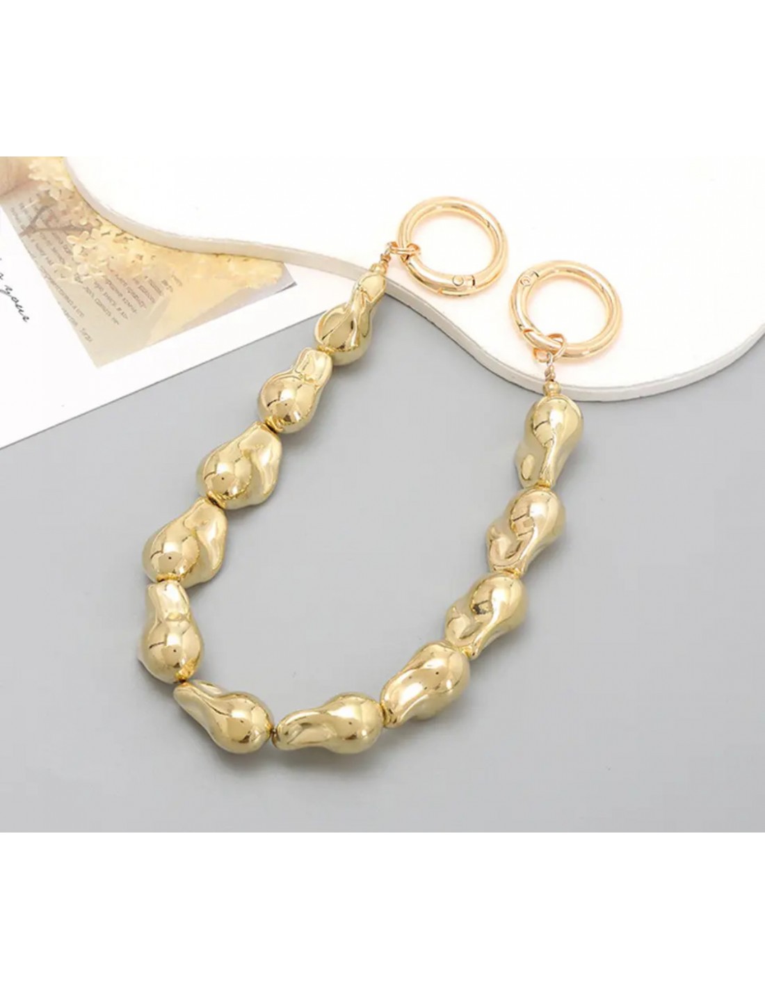 Espectacular asa corta tipo joya con acabado en dorado brillante. Sus eslabones de diseño orgánico (tipo pepitas irregulares) aportan un volumen y brillo únicos. Incluye dos anillas redondas de apertura fácil en los extremos para colocarla en segundos. La pieza definitiva para elevar tus bolsos de fiesta.