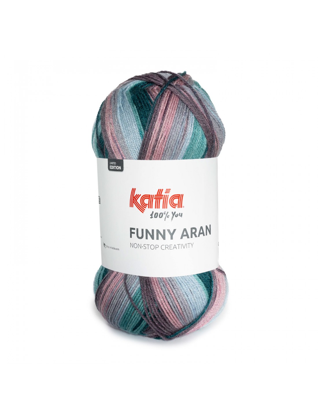 Katia Funny Aran es un ovillo tipo cake de edición limitada, con un precioso estampado multicolor clásico y de gran impacto visual. Su formato generoso permite tejer prendas completas con muy pocos ovillos: un solo ovillo es suficiente para un jersey de niña, mientras que dos bastan para una talla de mujer. Ideal para jerseys, bufandas, ponchos o prendas cómodas y alegres.
