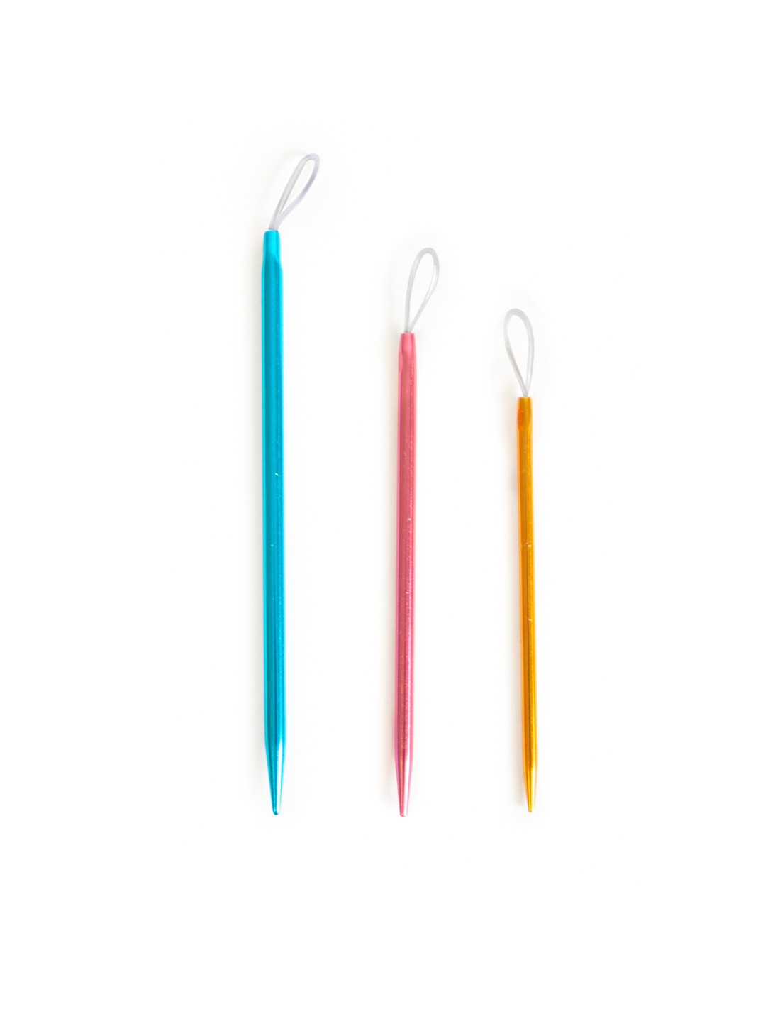Set de tres agujas laneras de aluminio con distintos grosores y tamaños para coser prendas de punto y unir piezas de crochet. Al estar hechas de aluminio, estas agujas para lana se deslizan fácilmente entre los puntos de cualquier labor. El resistente bucle de nylon que forma el ojo de la aguja de costura permite un fácil y rápido enhebrado de lanas de mayor grosor. Usa estas agujas de coser para esconder las hebras de tu labor o para realizar bordados en punto jersey o añadir detalles personalizados a tus proyectos de ganchillo. Longitud de 5 cm.