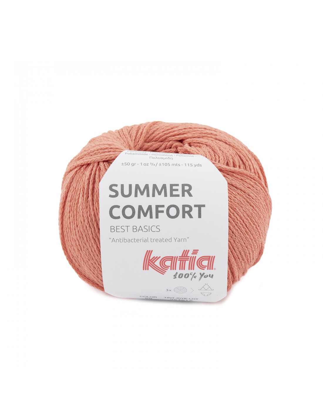 Este hilo fino de construcción tipo cordón combina poliamida y viscosa, mejorando así la elasticidad de tops ajustados o bañadores para la playa. Al ser principalmente de viscosa, las prendas tejidas resultan muy frescas y livianas. Además, hemos aplicado a Summer Comfort un tratamiento antibacteriano que crea una barrera protectora en la superficie del hilo. Evita la proliferación de gérmenes y hongos gracias a este hilo antibacteriano que asegura el mejor cuidado de nuestra piel. El tratamiento previene la absorción de los malos olores y potencia el poder del detergente al lavar las prendas. Nota: la efectividad de este tratamiento se mantiene durante aproximadamente 25 lavados. ¿Qué vas a tejer con él? Ovillo de 50 gramos y 105 metros. Se recomienda tejer con agujas del 3,5 -4 o ganchillo del 3,5 - 4. Para realizar un bikini son necesarios 3 ovillos. Para la muestra de 10x10 cm trabajar 23 puntos y 33 vueltas. Lavable en lavadora.