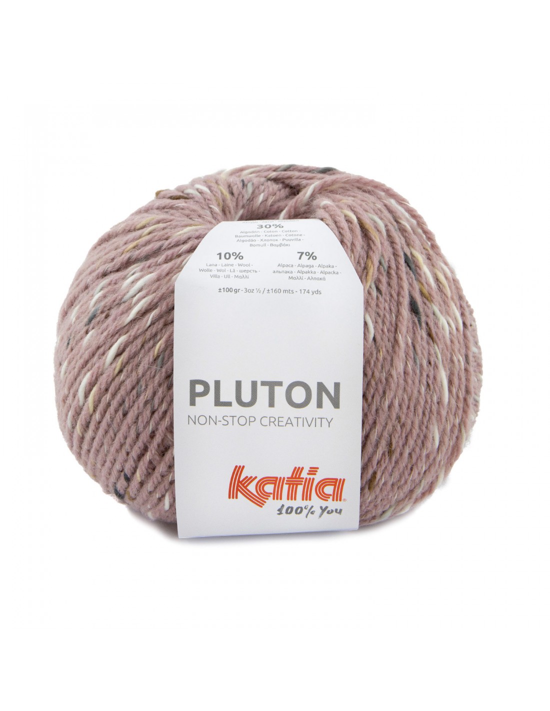 Katia Pluton simula un interesante efecto tweed, el estampado de moda de la temporada. Comprueba la versatilidad de este ovillo de aspecto, volumen y tacto inmejorable. Prepara tus agujas y ganchillos 5 mm, unos ovillos Katia Pluton y encuentra tu próximo proyecto entre los nuevos patrones de la revista Sport y Niños. Ovillo de 100 gramos y 160 metros. Se recomienda tejer con agujas del 5-5,5 mm o ganchillo del 5,5-6 mm. Para realizar un jersey de mujer de manga larga talla 42 se necesitan 5 ovillos. Para la muestra de 10x10cm trabajar 15 puntos y 21 vueltas. Lavable a máquina hasta 30°C en programa para lana. No usar secadora.